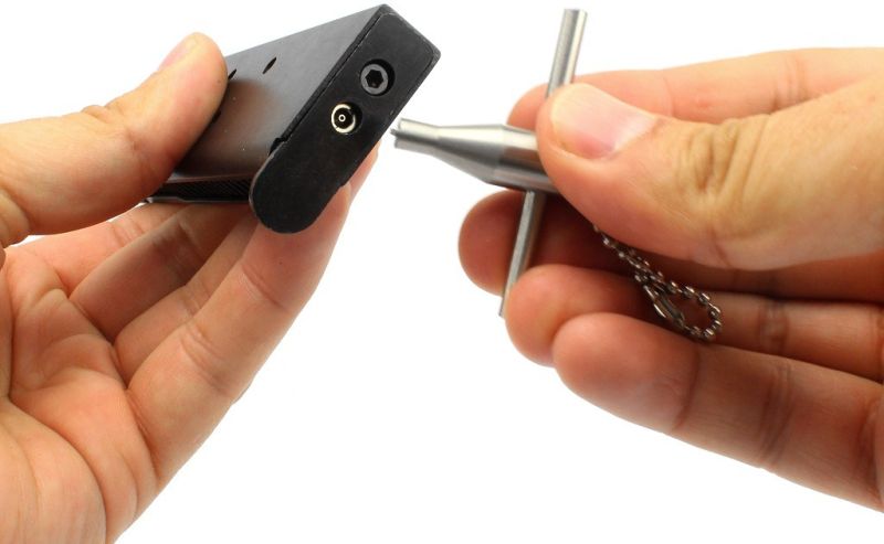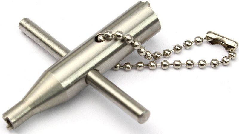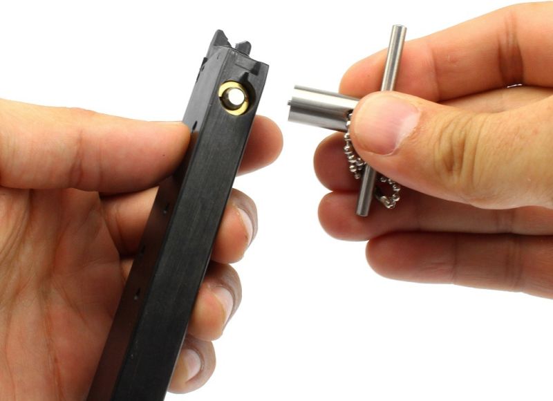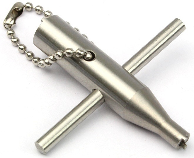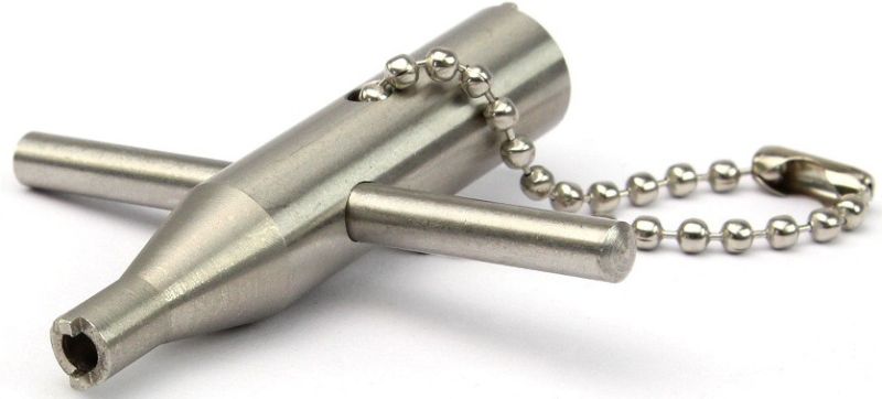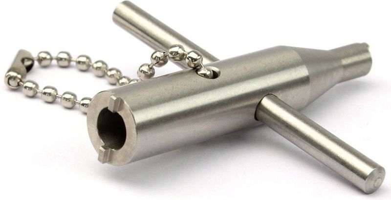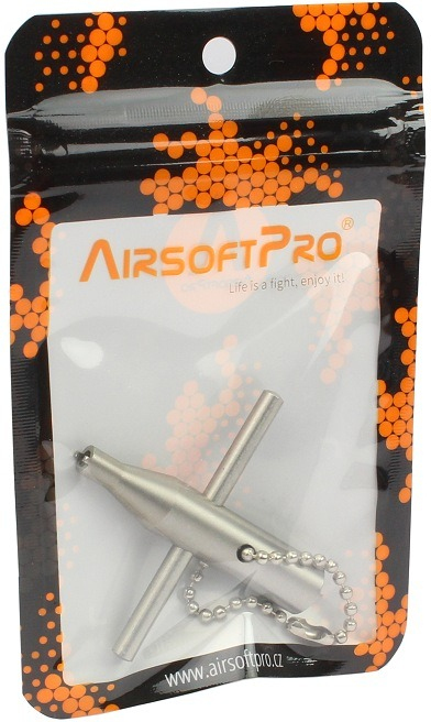 Kľúč z nehrdzavejúcej ocele na ventily plynových pištolí. Jeden koniec je určený na plniace ventily a druhý na vypúšťacie ventily. Použiteľný pre väčšinu známych ventilov pištolí. Vhodný aj pre plniace ventily Tokyo Marui.
