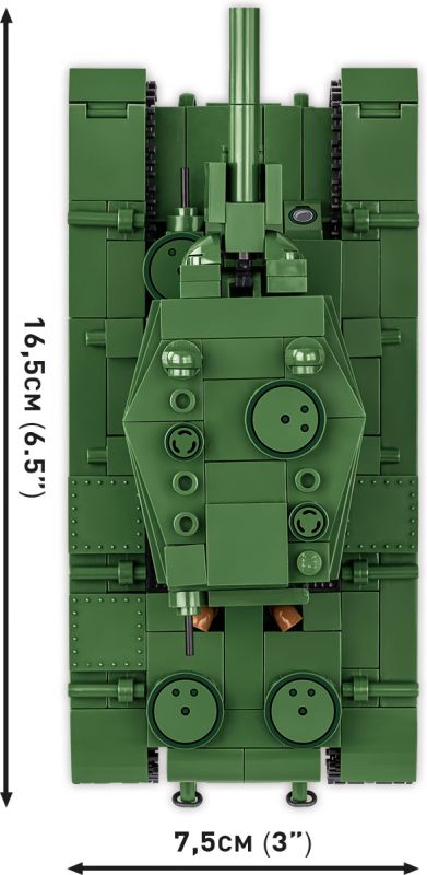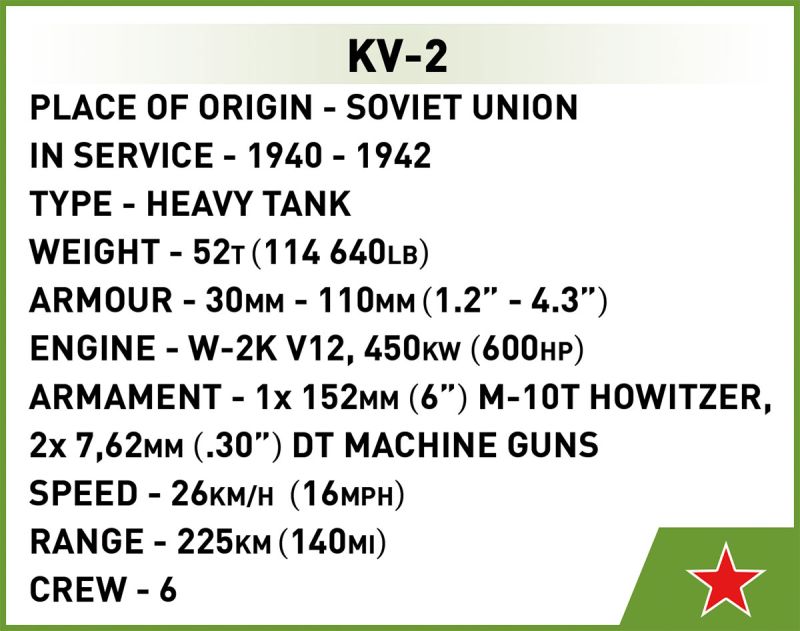 Táto stavebnica predstavuje slávny sovietsky ťažký tank Kliment Vorošilov KV-2 v typickej zelenej armádnej kamufláži. Model má otočnú vežu s nastaviteľným námerom kanónu a funkčné pásy, vďaka ktorým sa dá ľahko pohybovať po nekĺzavom povrchu. Menší model v mierke 1:48 ponúka skvelý zážitok zo stavania a zaberá minimum miesta na poličke.