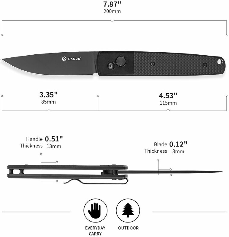 GANZO Zatvárací nôž G721B ButtonLock Black je praktický a robustný nôž navrhnutý pre každodenné nosenie (EDC). Vďaka čepele z nehrdzavejúcej ocele 440C je odolný voči korózii a poskytuje výbornú schopnosť držať ostrie. Čepeľ je typu "Drop Point" s dĺžkou 85 mm a hrúbkou 3 mm, čo je ideálna kombinácia pre rôzne úlohy v prírode alebo pri bežnom používaní.